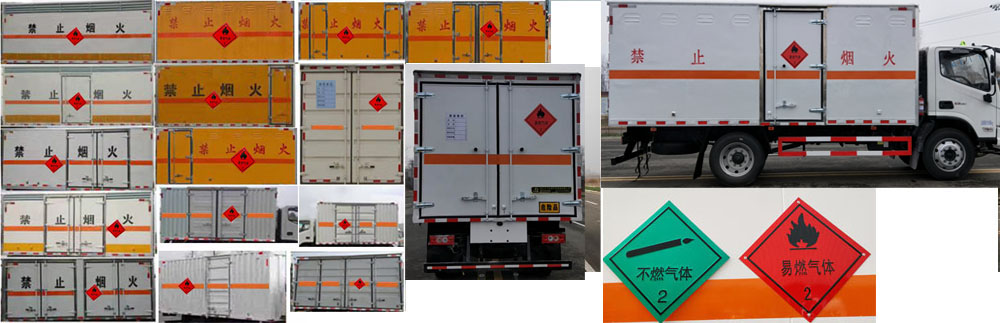 备注 | 该车为危险品运输车.该车顶部封闭,不可开启.运输独立容器(瓶)包装的易燃气体气瓶:液化石油气,压缩天然气,压缩氢气,乙炔,丁烷,丙烷,丁烯,丙烯,甲乙醚,打火机或打火机加油器,类项号2.1;运输独立容器(瓶)包装的非易燃无毒气体:压缩空气,压缩氧,二氧化碳,压缩氮,压缩氦,压缩氩,压缩氖.类项号2.2.选挂2.1类易燃气体警示牌或2.2类非易燃无毒气体警示牌.整车长/前悬/轴距/后悬对应关系为(mm):7100/1130/3800/2170,7320/1130/3800/2390.后部安装液压尾板,液压尾板收起水平长度300mm,尾板重量为450kg,侧防护材料:Q235,连接方式:焊接连接,后防护由专用装置代替,后部专用装置离地高为480mm;选装后部不带尾板样式时侧、后防护装置材料:Q235,连接方式均为焊接,后防护截面高100mm,截面宽50mm,下边缘离地高480mm.选装侧开门型式及位置;选装侧开门时整车宽度为2480mm;选装不开侧门时整车宽度为2430mm.厢体选装开百叶窗.仅采用排气管前置,子午胎,限速装置,辅助制动装置和前盘制动器的底盘;限速80km/h.安装具有卫星定位功能的行驶记录仪;ABS系统控制器型号/生产企业:ABS-E/威伯科汽车控制系统(中国)有限公司,ABS-VI·E/广州瑞立科密汽车电子股份有限公司.发动机型号及油耗值(L/100km)对应关系为: F3.8NS6B156/20.8.转向轴已随底盘安装防爆胎装置. |