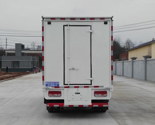 选装排半驾驶室。导流罩为选装结构,可选装车厢两侧LED屏结构;后门可选双门或不开门结构,选装后部结构。车厢顶棚封闭,并采用衍架结构,可升降,车厢两侧板可展开,与顶棚形成整车舞台顶棚;活动舞台板可折叠于车厢内,通过展开装置展后与固定舞台台面形成整车舞台台面;底盘大梁部分设有支撑装置。侧防护采用冷弯型钢/Q235-B,焊接连接,后防护采用冷弯型钢/Q235-B,焊接连接,后防护截面高度尺寸120mm,截面宽度尺寸50mm,下边缘离地高度420mm。ABS系统控制方式是4S/4M,ABS系统控制器型号是CM4XL-4S/4M,ABS系统控制器生产企业是广州科密汽车电子控制技术股份有限公司。该车作为流动演出的、可展开成为舞台。 |