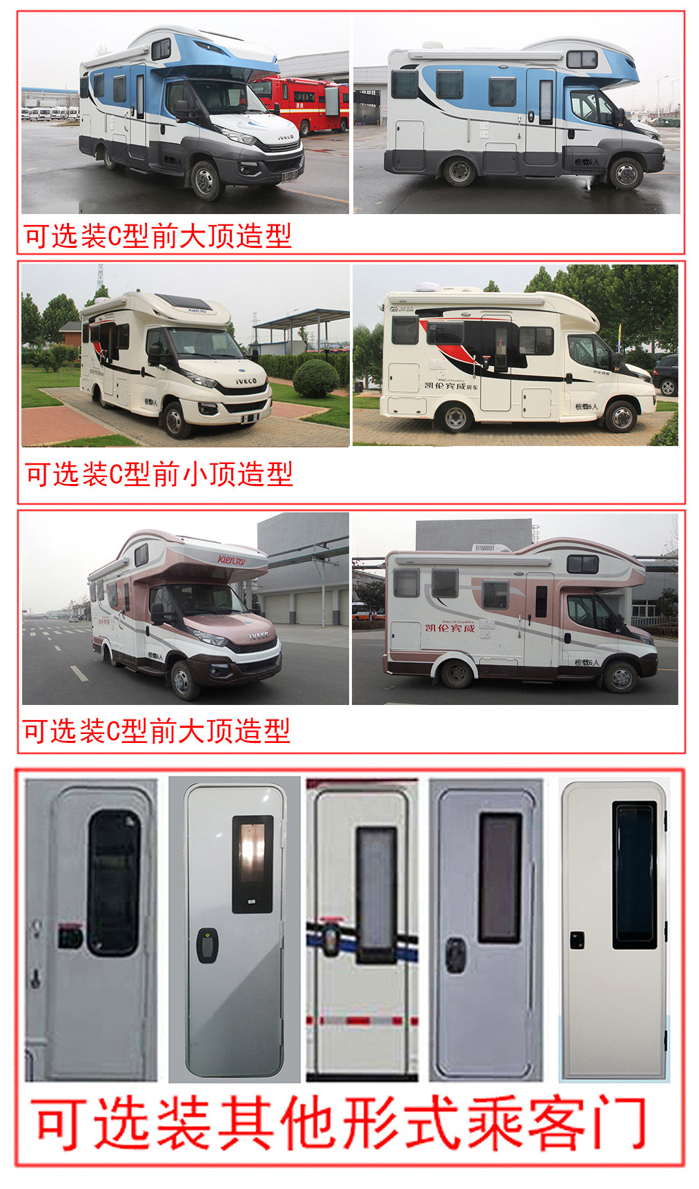 凯伦宾威牌依维柯C型旅居车在外观时尚霸气造型圆润流畅,可有效降低风阻系数,整车外形尺寸为5990×2360,2430,2500,2540×3140,3180,3240(mm),房厢采用玻璃钢复合车身结构及阻燃保温材料,做工精细;房厢内部配置齐全,床,洗手间,厨房,冰箱,,储物仓,暖气设备,灭火器等等。