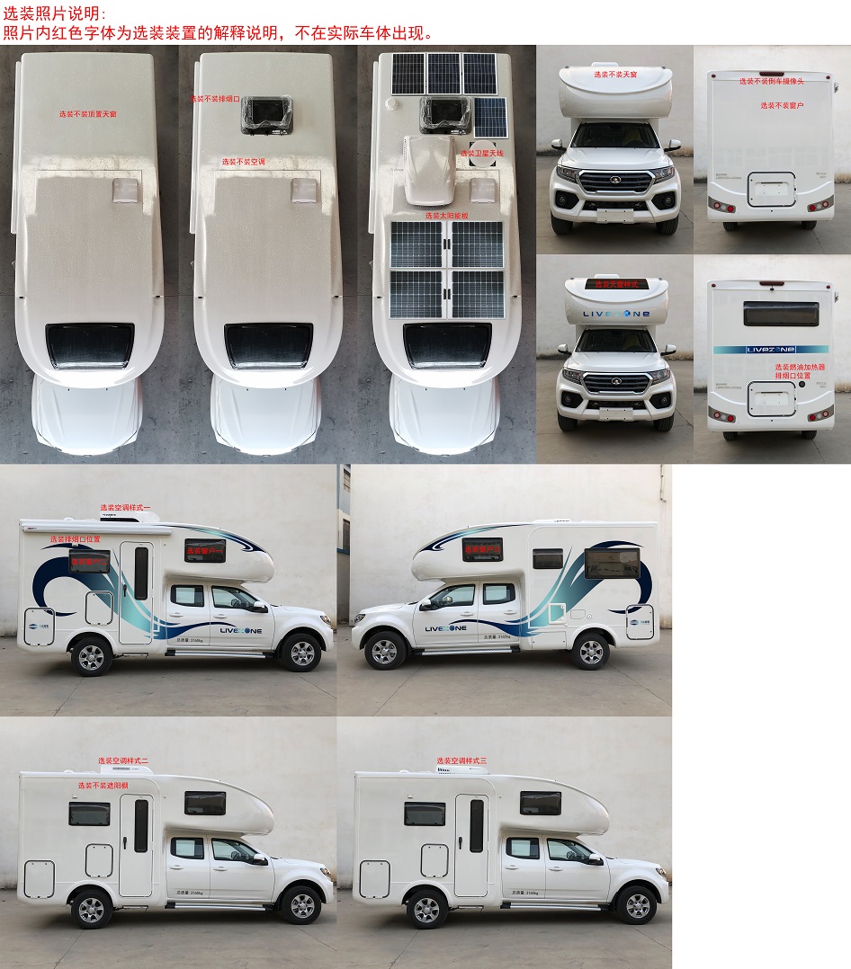 主要装置有:空调、照明设施、桌椅、睡具、炊具、卫生洁具、储藏设施、电视等专用装置.整车选装中网,轮辋.前部选装:一种彩条,一种天窗样式,选装不带天窗;左右侧选装:一种左右对称彩条,左侧选装一种窗户大小;右侧选装排风扇位置,选装两种窗户;选装不带遮阳棚(宽度2055mm),顶部选装一种卫星天线,太阳能板及数量,不装排烟口,三种顶置空调(1种高顶整车高度3080,2种低顶3040),顶部选装不装顶置空调(不带空调时高度为2900mm),顶部选装不装空调不装天窗高度为2875mm,后部选装:燃油加热器排烟口位置,一种彩条,选装不装倒车摄像头,选装不装窗户,因选装件引起的质量变化在3%以内.ABS型号及生产企业:ABS9/博世汽车部件(苏州)有限公司.发动机净功率值为110kW.车厢后部座椅仅驻车休息时使用. |