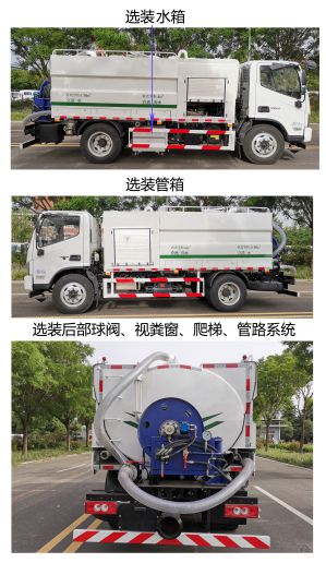 选装选装管箱和水箱和选装后部球阀、视粪窗、爬梯、管路系统,水箱是为了吸污作业时冷却水循环泵提供水,水箱容积为300升;1,该车专用装置由污水罐和清水罐组成,用于下水道排污及疏通;污水罐体外形尺寸(长×长轴×短轴)(mm): 3100×1850×1400,污水罐有效容积:6立方米,运输介质为液态污物,介质密度为800千克/立方米。清水罐是由2个相同的不规则罐体组成,单个罐体外形尺寸长: 2860mm,运输介质为液态水,介质密度为1000千克/立方米。有效容积1.56立方米;2,清水罐和吸污罐为两个独立罐体,清洗功能时用水罐,吸污功能时用吸污罐,清洗吸污两种功能不同时使用,清水罐和污水罐不能同时满载;3,侧防护材质Q235,螺栓连接;后防护材质Q235,螺栓连接,后防护截面尺寸140mm×60mm,下边缘离地高度410mm,ABS系统控制器型号/生产企业:ABS-E/威伯科汽车控制系统(中国)有限公司,ABS-VI·E/广州瑞立科密汽车电子股份有限公司;4,仅选用发动机F3.8NS6B156和3800轴距改装。 |