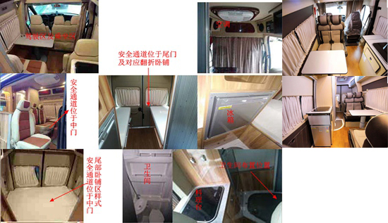 车顶选装空调、卫星天线、换气扇、车顶行李架、太阳能板;车顶右侧选装遮阳棚;车身中门可选装电动踏步或一体式踏板;选装新品发动机舱格栅;尾部选装爬梯、自行车架;车身右侧选装推拉式玻璃,左侧座椅区选装隐藏式推拉玻璃、卧铺区选装盲窗.尾门玻璃处可选装单侧或双侧外推窗.车身右后侧选装行李舱门;车身左侧选装外接充电电源接口、重力加水口.不选装车顶设备高2595mm,选装天窗,行李架或太阳能板高2630mm,选装车顶空调2790mm,选装卫星电视天线高2770mm.车顶右侧位置选装遮阳蓬,尾门位置选装爬梯,选装自行车架.车身四周选装粘贴备案样式彩条.配备卧具,餐桌,卫生间,液晶电视等旅居生活设施和娱乐设施.ABS系统控制器型号: 6C11 2M110 A*或CC11 2C405 A*或EV7021,生产厂家:博世汽车部件(苏州)有限公司.发动机最大净功率为101kw. |