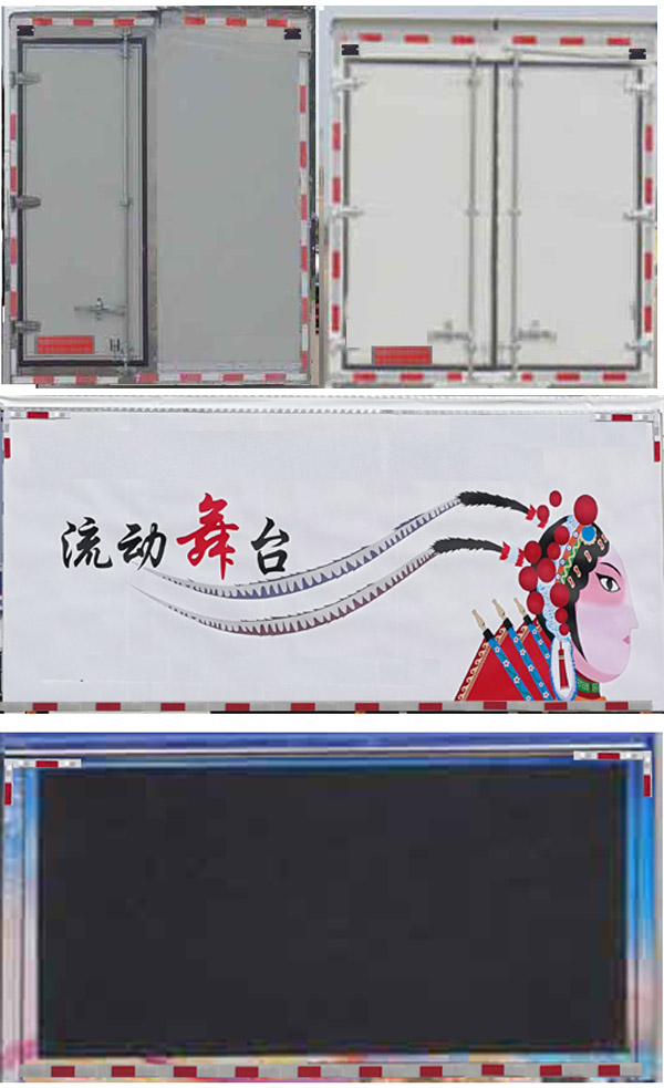 随底盘选装驾驶室,新款前部灯具、前面罩及后视镜,选装无导流罩结构,选装车厢两侧或一侧LED屏幕结构,选装厢体两侧图案,选装后门结构样式;车厢顶棚封闭,并采用衍架结构,可升降,车厢两侧板可展开,与顶棚形成整车舞台顶棚,活动舞台板可折叠于车厢内,通过展开装置展后与固定舞台台面形成整车舞台台面;底盘大梁部分设有支撑装置;侧防护材料Q235,螺栓连接,后防护材料Q235,焊接连接,后防护截面高度尺寸120mm,截面宽度尺寸50mm,下边缘离地高度400mm;ABS型号:CM4XL-4S/4K(4S/4M),VIE ABS-II,对应生产厂家:广州瑞立科密汽车电子股份有限公司,浙江万安科技股份有限公司;该车主要装置为厢体,厢体可展开用于舞台文艺表演. |