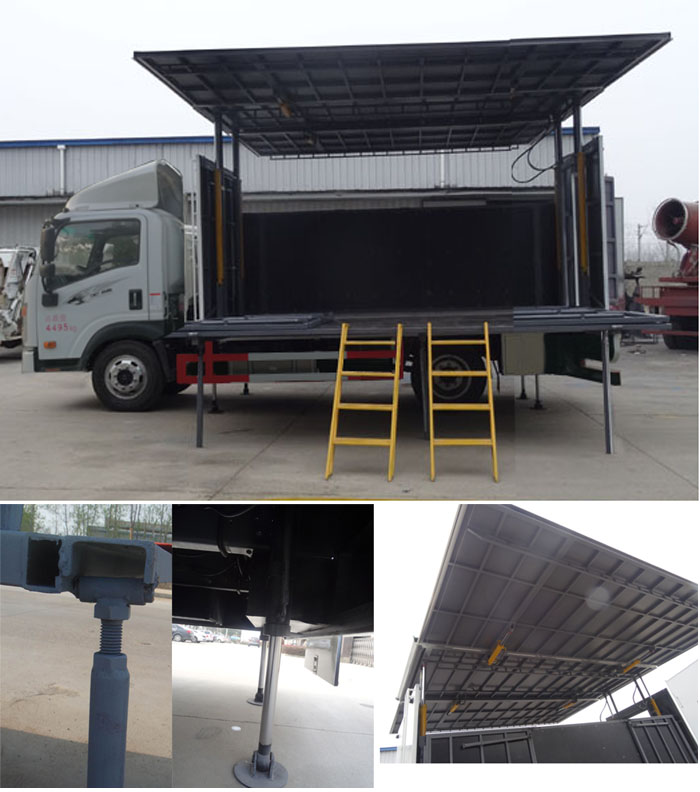 整车舞台展开方式有单展/双展/三展可选,全自动液压系统操作,省时省力。随车配有舞台梯、灯光挂架、幕布挂钩及电源箱。可选装空调、音响平台、LED显示屏等。