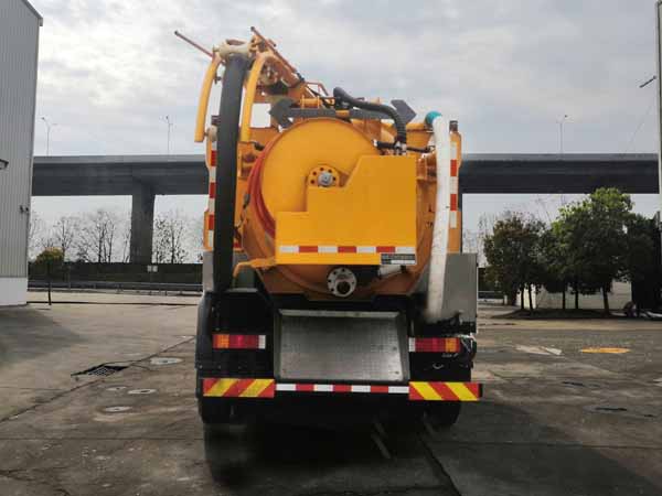 该车主要专用装置罐体、高压水泵、吸污泵、管道系统等,用于下水管道的冲洗疏通及管道内污水的收集。吸污罐罐体外形尺寸(直径×长):1512mm×4952mm;吸污罐有效容积为8.49立方米,介质为液态污物,密度:900千克/立方米。清水罐截面为多边形组成,截面积为0.678立方米,长度为3300mm,清水罐的有效容积为4.47立方米,介质为水,密度是1000千克/立方米。清水罐和吸污罐不能同时满载。当驾驶室准乘人数为2人时,额定载质量为7350千克。侧防护材料材质为铝合金,侧防护与副车架螺栓连接;后防护材料材质为Q235A,后防护与大梁螺栓连接,后防护断面尺寸为120mm×60mm,离地高度为425mm。仅采用底盘轴距为4350mm+1350mm。装备ABS,ABS型号/生产厂家:3631010-C2000/东科克诺尔商用车制动系统(十堰)有限公司,ABS还可为ABS 8/东科克诺尔商用车制动系统(十堰)有限公司或4460046450/威伯科汽车控制系统(中国)有限公司。随底盘选装驾驶室。 |