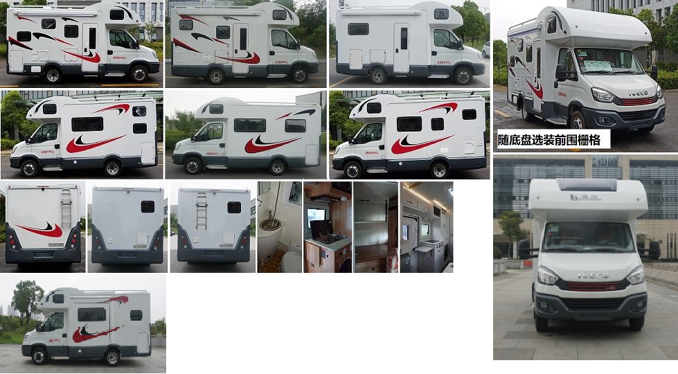 1.该车装备桌椅、睡具、厨具、卫生间等旅居生活专用装置;2.外部选装不同位置的门窗、储物舱门、220V外接市电口、注水口,内部选装不同布局,后部选装爬梯;3.两侧及后下部为裙边结构代替侧后防护,侧防护离地高度340mm,后防护离地高度410mm;4.ABS系统控制器型号:BOSCH ABS9, ABS系统控制器生产企业:BOSCH公司,发动机最大净功率为105kW;5.随底盘选装ESP,选装自动变速箱,随底盘选装前围栅格. |