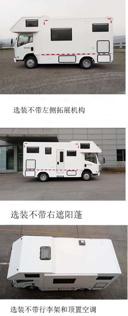 1、发动机净功率为140kW;2、厢体内部按旅居卧室布置,配置卫生间、床、桌椅、储物柜和炊具。两侧和后下部为裙边式围板防护替代侧后防护的功能;3、该车装ABS,ABS及其控制器型号为:APG3550500A4,生产厂家为:浙江亚太机电股份有限公司;4、该车装4HK1-TC51发动机,油耗申报值为12.6L/100km;5、该车选装顶置行李架或顶部空调,选装顶部空调时,车辆高度为3280mm;6、该车选装左侧拓展机构或右侧遮阳蓬,此时车宽为2360mm;选装左侧拓展机构和右侧遮阳蓬时,车宽为2455mm;不选装左侧拓展机构和右侧遮阳蓬时,车宽为2255mm。 |