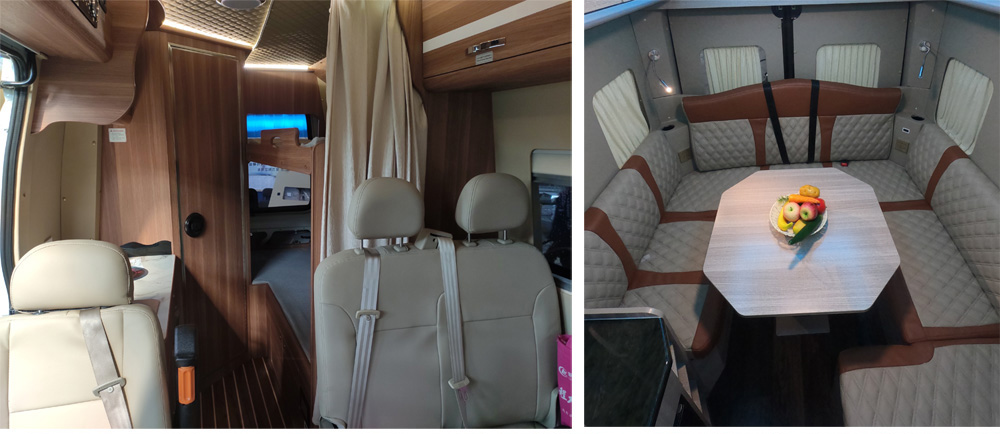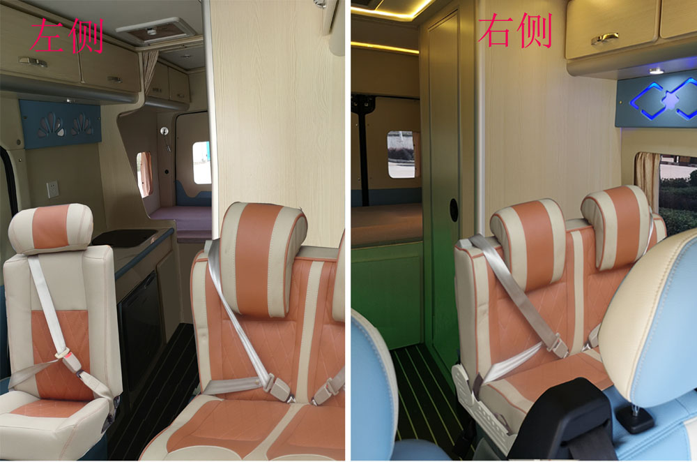该车设有:睡具,炊具(微波炉),卫星接收器(顶部),热水器,卫生设施及必要的照明和空气调节等设施;选装尾部可拆卸后踏板,自行车架,后爬梯时整车长(mm):5950;选装顶部行李架,后部无选装时整车长(mm):5750;整车长与后悬的关系:5950/1425,5750/1225;ABS型号:MK70MXT;ABS生产厂家:大陆泰密克汽车系统(上海)有限公司,扩展内部布局。 |