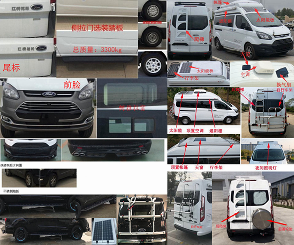 1.车内装备桌椅、炊具、卫生设施、给排水等设施; 2.随整车底盘选装:轮辋样式,前脸,侧拉门踏板,尾标,侧拉窗;选装前后大包围;3.不带侧拉门踏板时整车宽度为2032mm,选装侧拉门踏板时整车宽度为2100mm(该车安装遮阳棚不影响整车宽度);选装顶置帐篷时整车高度为2630mm,选装顶置空调时整车高度为2697mm,选装后爬梯时整车长度为5541mm,选装自行车架时整车长度为5641mm;4.选装太阳能板、顶置行李架、顶置天窗、夜间照明灯、后备胎;5.全车长度为5341mm时对应前悬/后悬: 1014/1027mm、全车长度为5541mm时对应前悬/后悬: 1014/1227mm、全车长度为5641mm时对应前悬/后悬: 1014/1327mm;6.ABS控制器型号:EV5051,生产厂家:博士汽车部件(苏州)有限公司,发动机最大净功率147KW.选装内部布局. |
