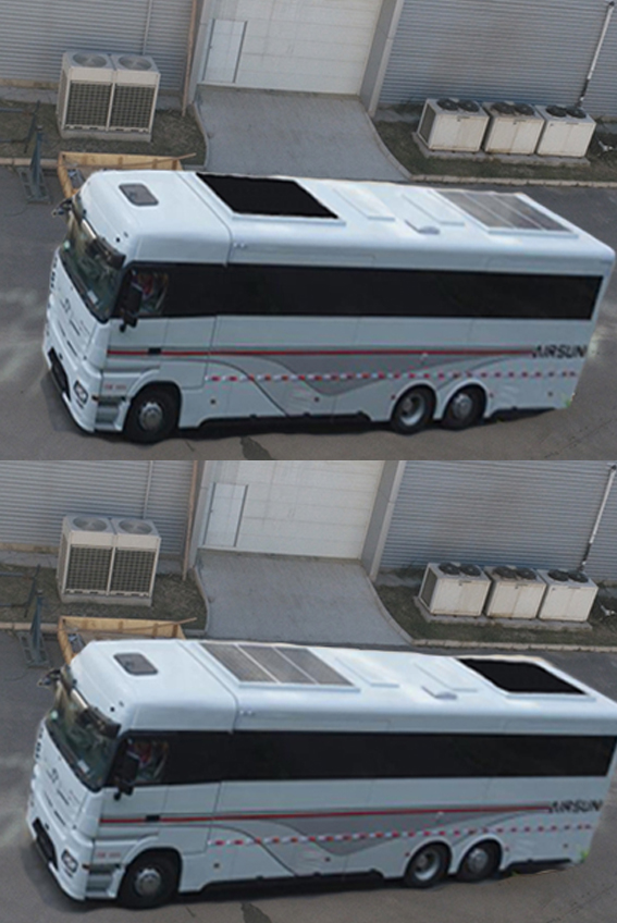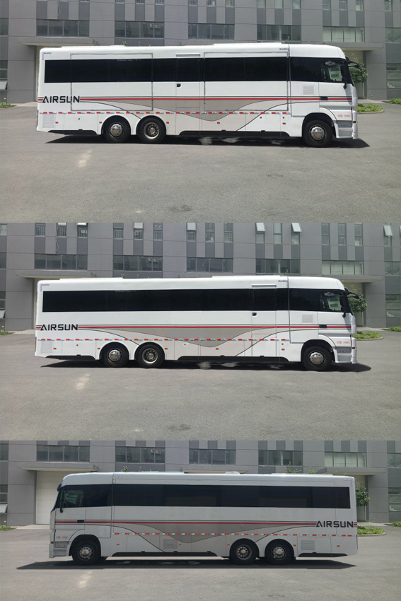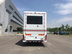 顶部封闭,不可开启。车身选装玻璃外装饰、车门、百叶窗、侧拉箱的数量和安装位置。车顶选装空调机、太阳能板、玻璃天窗的形状数量及安装位置。内部选装厨具等生活用品。该车行驶过程中,后厢内不坐人。该车装有ABS,ABS型号ESP8.1,厂家BOSCH。轮胎型号层级为:295/80R22.5 18PR。由于侧面与后面下仓装有专用设备,所以强度测试为豁免。车身侧下檐离地高340mm,后下檐离地高490mm。第三轴为随动轴,不可提升。 |
