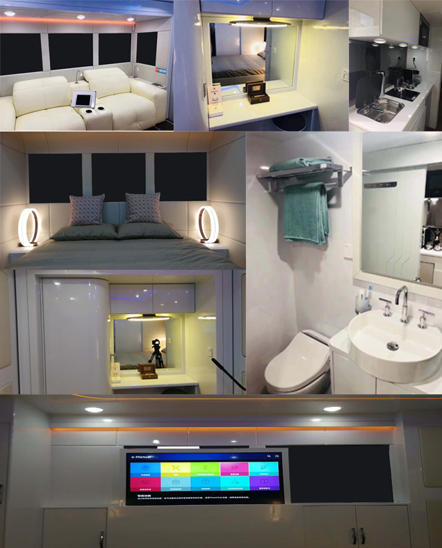 载通牌奔驰A型旅居车在外观时尚霸气造型圆润流畅,可有效降低风阻系数,整车外形尺寸为11980×2550×3910(mm),房厢采用玻璃钢复合车身结构及阻燃保温材料,做工精细;房厢内部配置齐全,床,洗手间,厨房,冰箱,,储物仓,暖气设备,灭火器等等。