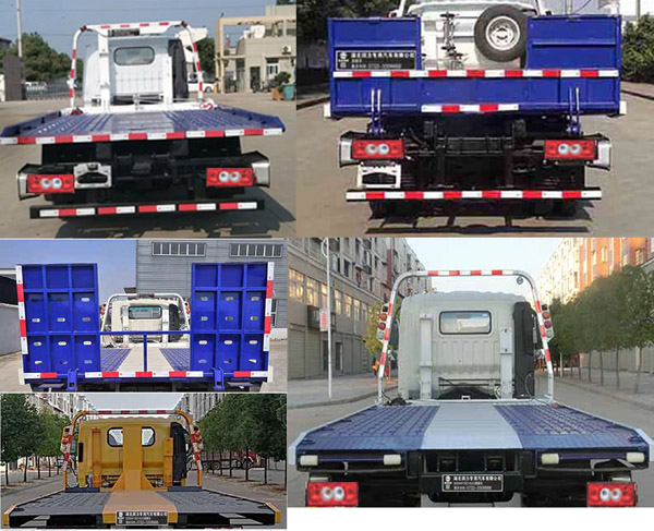 该车配备牵引绞盘和托举平板.用于道路车辆清障,城市清障救援.随底盘选装驾驶室.托举质量500千克.侧、后防护材料采用Q235B,与车架焊接连接.后防护截面尺寸(宽×高) (mm):50×100,离地高430mm.ABS型号为CM4XL-4S/4M,生产厂家为广州瑞立科密汽车电子股份有限公司.选装后部翻转板结构样式. |