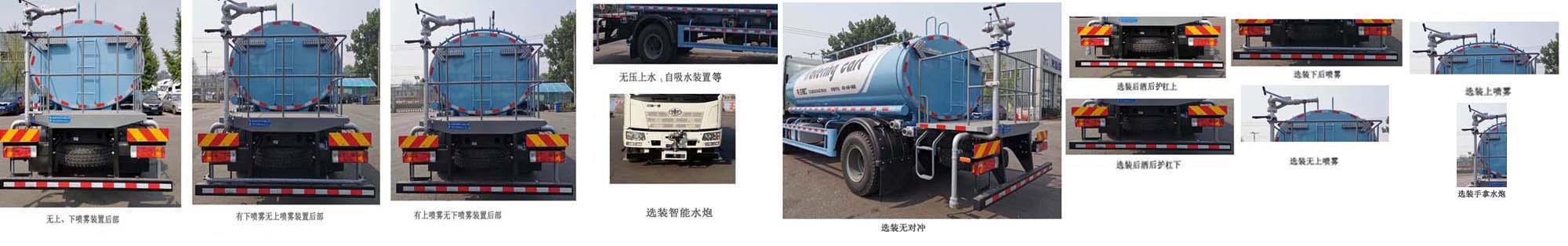 罐体有效容积11立方米.介质:水.罐体长4650mm,长轴2240mm,短轴1440mm,侧后防材料材质:Q235.侧防护支撑座与副车架焊接,侧防护与支撑座螺栓连接,后防护与车架螺栓联接,后防护断面尺寸:120mm×80mm,后防护离地高度:460mm.ABS系统型号为CM4XL,生产企业为长春瑞立科密汽车电子有限公司.该车选装智能水炮.前延伸450;总长=(前延伸)+前悬+轴距+后悬对应关系为:8580mm=(450)mm+1400mm+4500mm+2230mm;8130mm=1400mm+4500mm+2230mm.装备限速装置,限速89km/h.随底盘选装前围和灯具,选装宽体保险杠,脚踏板,选装梯子低扶手时高度3050mm,选装上、下喷雾装置,无压上水、手持水炮、对冲洗、花洒、自吸系统、自吸软管箱等 |