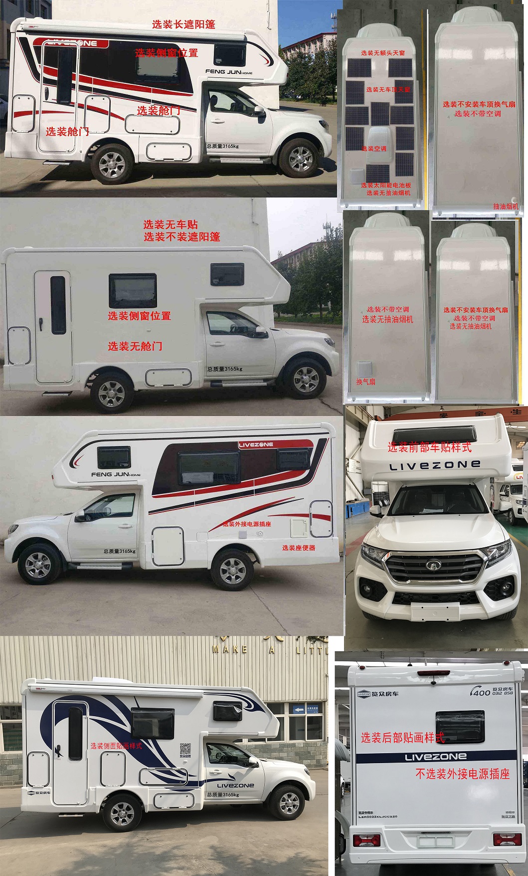 主要装置有:换气扇、照明设施、桌椅、睡具、炊具、卫生洁具、储藏设施、电视等专用装置,整车选装中网,轮辋,侧踏,前雾灯装饰罩,前保险杠格栅,前部选装一种车贴,侧面选装长遮阳棚,选装侧窗位置,选装舱门及位置,选装无舱门,选装无车贴,选装一种左右对称车贴,选装不安装遮阳棚,选装坐便器,选装外接电源插座,顶部选装太阳能板,选装无车顶天窗,选装无吸油烟机,选装不安装顶部换气扇,选装空调、选装不带空调,后部选装不带外接电源插座,选装一种车贴.选装不安装遮阳棚时宽为2045mm,选装不带抽油烟机不带换气扇不带空调时高度为2810mm,选装带抽油烟机不带换气扇不带空调时高度为2840mm,选装带换气扇不带空调换气时高为2880mm,带空调时高度为3030mm.ABS型号及生产企业:ABS9/博世汽车部件(苏州)有限公司.发动机净功率值为120kW.因选装件引起的质量变化在3%以内. |