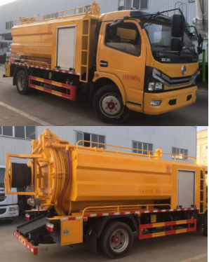 随底盘选装前面罩,前保险杠,前组合灯具,前雾灯,选装驾驶室。罐体外形尺寸(直段长×直径)(mm):4300×1450。有效容积6.36立方米。侧防护采用Q235,螺栓连接。后防护采用Q235,焊接连接。后防护截面高度尺寸120mm,截面宽度尺寸50mm,下边缘离地高度400mm。采用3800轴距底盘.ABS型号/厂家:ABS型号:ABS/ASR-24V-4S/4M,厂家:襄阳东风隆诚机械有限责任公司。专用装置为罐体,高压泵等,主要用于清洗吸污,选装车辆外观样式。 |