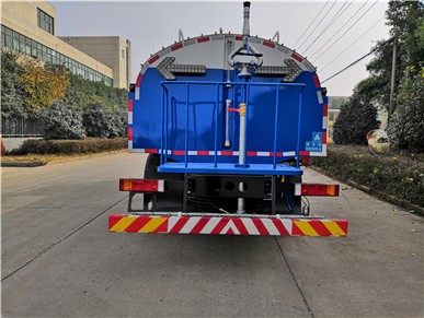 车身喷漆采用白蓝相配,寓意蓝天白云,保卫环境整洁的意思;整车外形尺寸为9345,9375×2500×2950(mm),罐体容量大,车辆额定载质量达到9030(Kg),保证了运输的水容量,改装配置上,加装有60米的耐高压钢丝清洗高压管,方便近距离作业;配上金属喷漆,提高车辆档次,确保罐体无掉漆,延长使用寿命,同时整车造型美观,比例协调。