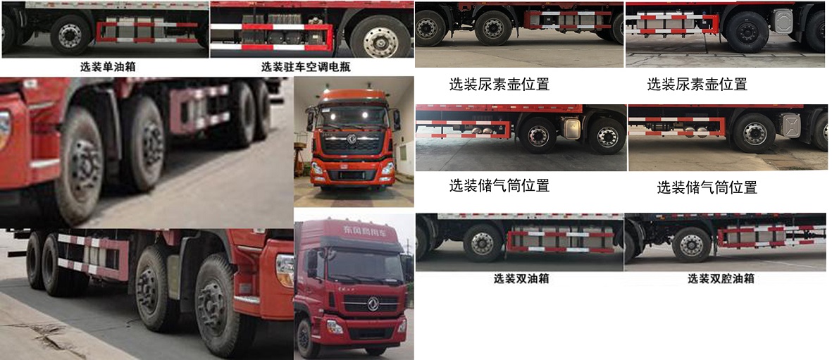 选装箱体结构.选装仅高度不同的驾驶室.选装侧窗装饰板,选装前雾灯,随底盘选装驾驶室及驾驶室前面罩,驾驶室顶部装饰灯为选装件,选装气喇叭.消声器可选装右置.随底盘选装油箱位置,选装单油箱、双油箱和双腔油箱,选装驻车空调电瓶,选装储气筒位置,选装尿素壶位置,选装前面罩装饰胶条.货箱底板到仓栅顶部的高度为2400mm,2500mm.侧防护:材质Q235,连接方式螺栓连接.后下防护:材质Q235,连接方式螺栓连接,断面尺寸120×60mm,离地高度460mm.安装具有卫星定位功能的行驶记录仪.装有ABS,ABS型号/生产厂家:3631010-C2000/东科克诺尔商用车制动系统(十堰)有限公司,ABS 8/东科克诺尔商用车制动系统(十堰)有限公司.前轴可选装盘式制动器. |