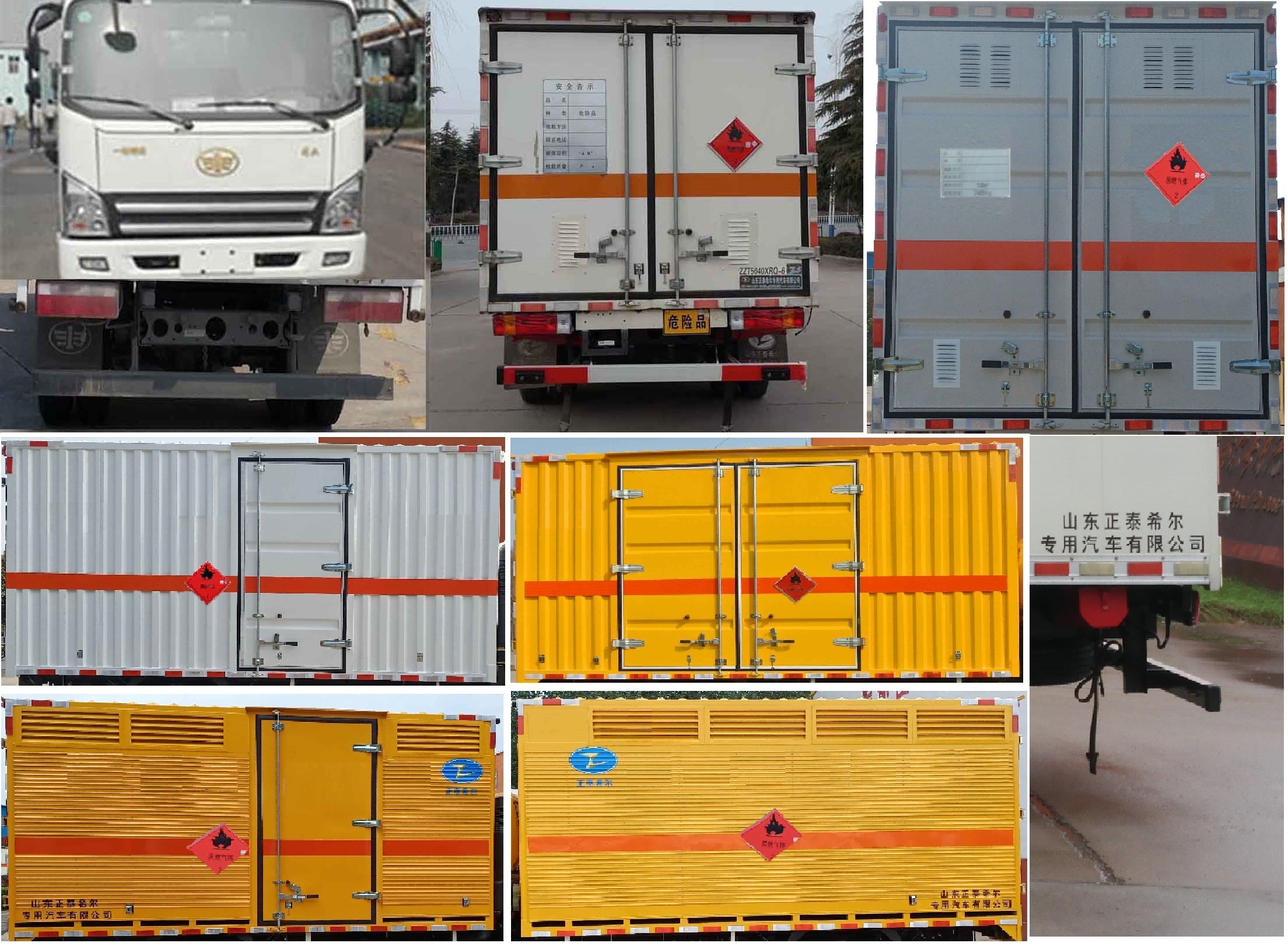 厢体顶部封闭,不可开启;厢体可选装无侧门;选装瓦楞厢体;厢体可选装不燃气体标志牌;选装多种形式的侧开门;选装后百页窗;随底盘选装新前围、后部灯具;车身侧面及后部粘贴橙色反光标识和易燃气体菱形标示;该车为危险货物运输车;在车体后部设置安全标示;运送危险品类项号:2.1;2.2;该车安装具有卫星定位功能的行驶记录仪;防护装置材料为Q235,与车辆连接方式为螺栓连接;后防护断面宽100×50mm,离地高450mm;发动机最大净功率为:WP2.3NQ130E61(92kw).ABS防抱死制动系统生产厂家/型号:1.广州瑞立科密汽车电子股份有限公司/CM4XL-4S/4M;2.浙江万安科技股份有限公司/VIE ABS-II;仅用子午线轮胎,仅用底盘限速装置及前盘制动;仅选用底盘的前置排气管结构;油耗对应关系:WP2.3NQ130E61(11.41);转向轮安装爆胎应急防护装置,选装不同形式的后防护装置,选装不同形式的瓦楞工艺厢体,该车型可选装ETC车载装置 |