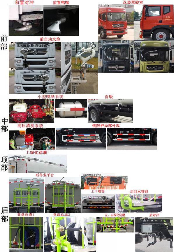 该车选用4500mm底盘轴距;该车装有水罐、水路系统、清洗工作装置、作业平台、控制系统,用于清洗作业;罐体外形尺寸(长轴×短轴×长度)(mm):2400×1420×4200.罐体有效容积10.3立方米;选装前置自动水炮时,前伸935mm,整车长9085mm;其余参数为标配型;侧面防护装置材料为Q235A,连接方式为螺栓连接,可选装其局部外观,后防护装置材料为Q345A,与车辆连接方式为螺栓连接;后部防护装置的断面尺寸为240×65mm,离地高度为485mm;该车可选装对冲、鸭嘴、小型喷洒系统、自吸、高压清洗系统、上绿化浇灌、后作业平台、后作业指示灯2、上下喷雾、后回水管路、后对冲、卷盘、左(右)绿化浇灌,该系列选装对于整车尺寸、重量变化可忽略不计..随底盘选装驾驶室外观,随底盘装有ABS,ABS系统生产厂家,型号 :焦作博瑞克控制技术有限公司,J ABS. |