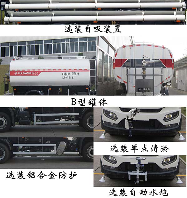 仅选用4500mm轴距;标配A型罐体外形长轴×短轴×长度(mm):2300×1350×5000;罐体有效容积:10.37立方米;选配B型罐体外形长轴×短轴×长度(mm):2400×1450×4500;罐体有效容积:10.53立方米;该车有4种配置:A(标配A型罐体)、B(选配B型罐体)、 C(选装单点清淤装置)、D(选装自动水炮); 各配置整备质量(kg)/载质量(kg)/整车长度(mm)/前悬(mm)/后悬(mm)/罐体有效容积(立方米)对应关系如下: 配置A:7925/9880/8330/1430/2400/10.37;配置B: 7770/10035/7980/1430/2050/10.53;配置C:7925/9880/9100/2200/2400/10.37;配置D:7925/9880/8780/1880/2400/10.37;随底盘选装另一种驾驶室时整车高度为2840mm;侧防护及后部防护装置的材料材质:Q235A,连接方式为螺栓连接;后部防护装置的断面尺寸(宽×高)mm:60×230,后部防护装置的离地高度460mm;随底盘驾驶室选装:前雾灯、前面罩、前脸扰流罩、前保险杠及前部灯具、前视镜、后视镜、侧窗装饰板、不同结构的车门裙板、上车踏板型式,驾驶室顶部中间3个装饰灯为选装件;可选装:1、后上喷雾装置;2、后下喷雾装置; 3、加宽平台;4、下水道疏通装置;5、左右侧浇花装置; 6、后部作业指示灯;7、铝合金侧防护;8、自吸装置;以上8种选装配置引起的重量及整车尺寸变化可以忽略不计;该车装备有罐体、水泵、管道系统等,用于清洗路面,对路面喷洒水降尘等作用。ABS型号/生产厂家:3631010-C2000/东科克诺尔商用车制动系统(十堰)有限公司;ABS 8/东科克诺尔商用车制动系统(十堰)有限公司。 |