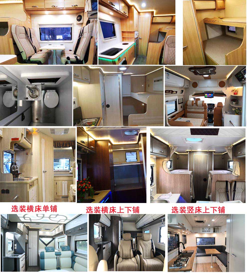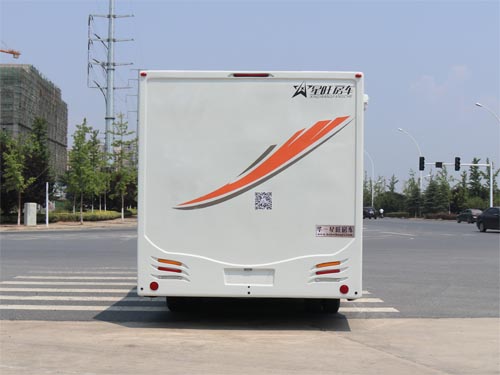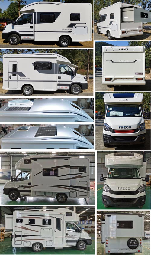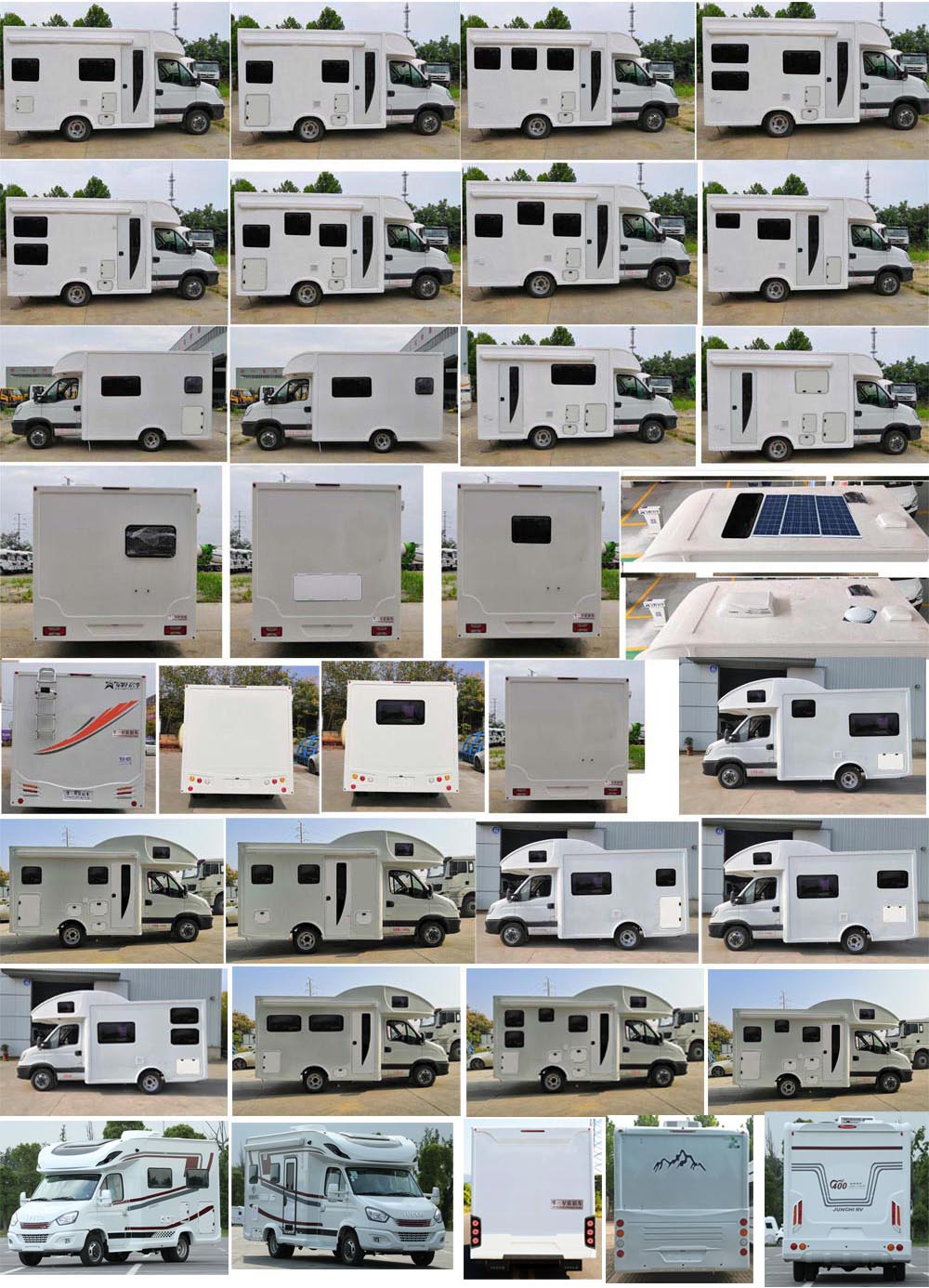 选装2种额头配置,小额头选装天窗,换气扇整车高度3050mm,小额头选装顶置空调整车高度3250mm,选装大额头整车高度3150mm;车厢两侧选装车门样式,散热格栅,舱门,车窗样式,遮阳蓬;车厢后部选装仪器舱门,车窗,自行车架和后爬梯;车顶可选装顶置空调,扶手,换气扇,天窗,太阳能电池板,卫星天线;该车侧防护和后防护为裙边结构,侧防护下边缘离地高度240mm,后防护下边缘离地高度400mm; ABS系统控制器型号:BOSCH ABS9, ABS系统控制器生产企业:BOSCH公司;发动机最大净功率105kW;该车配备有桌椅、炊事设施、床、卫生设施及必要的照明和空气调节等旅居生活设施,用于旅行宿营。 |