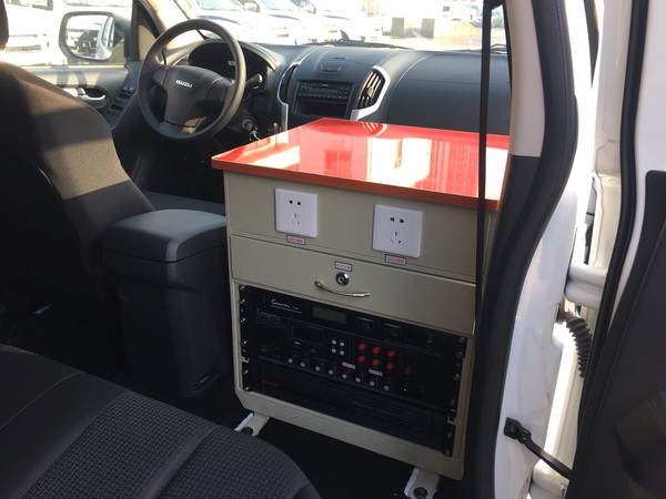 主要配置:UPS不间断电源、功放、无线语音接收机、宣传屏等,车内可选装工作台放置相关的专用装置。车身顶部选装云台摄像机。ABS系统控制器型号:V3G-N,生产企业:DENSO CORPORATION Daian Plant。车身顶部选装云台摄像机时高度为2320mm。车内选装工作台时驾驶室准乘人数为1+3(人)。专用装置见选装照片。随底盘选装新款前组合大灯、前雾灯、中网、前保险杠。 |