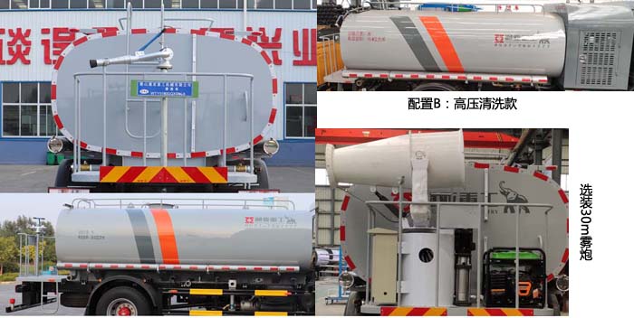 加装罐体及清洗装置,用于清理路面或管道沉积物或清洗机械表面;仅采用轴距为:4500mm;罐体有效容积为10.5立方米,配置A:罐体尺寸(长×宽×高)(mm):4900×2350×1350;整车长度为8250,接近/离去角:19/12°,后悬2350.配置B:罐体尺寸(长×宽×高)(mm):4200×2350×1350;整车长度为9350(含950前伸),接近/离去角:8/11°,后悬2500.选装前部喷头为万向鸭嘴喷头,选装中置对冲喷水装置,选装后部加装箭头式指示灯,选装后部平台样式及护栏高度;选装选装照片2中外观喷涂;侧后防护装置材料均为:Q235,侧防护装置与车架连接方式为螺栓连接,后防护装置与车架连接方式为焊接,后防护装置截面尺寸为:120×68mm,离地高度480mm;ABS型号/生产厂家:3631010-C2000/东科克诺尔商用车制动系统(十堰)有限公司,ABS 8/东科克诺尔商用车制动系统(十堰)有限公司,4460046450/威伯科汽车控制系统(中国)有限公司. |