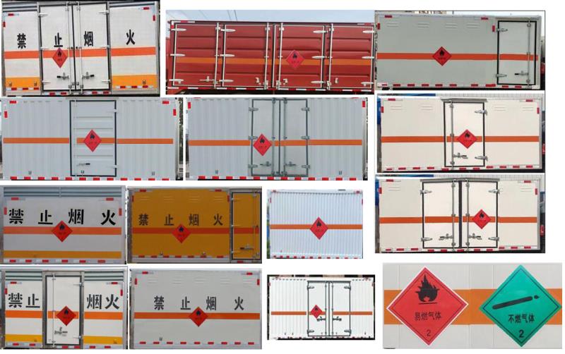 备注 | 该车为危险货物运输车;选用危险品运输车专用底盘,排气管随底盘前置,顶部封闭不可开启,危险货物运输车辆的车辆类型:FL型车辆;运输具有独立容器包装的易燃气体:液化石油气,压缩天然气,压缩氢气,甲烷,乙炔,乙烷,丁烷,丁烯,丙烯,二甲醚,运输具有独立容器包装的非易燃无毒气体:压缩空气 (二氧化碳,氧,氮,氦,氩,氖),运送危险品类项号:2.1,2.2,选装非易燃气体标识;随车装备有灭火器,随底盘安装具有卫星定位功能的行驶记录仪,随底盘安装有限速装置,限制最高车速80km/h;随底盘前轮安装有防爆应急装置,随底盘安装有盘式制动器和ABS,ABS系统型号 :ABS-VI.E,ABS-E,生产企业:广州瑞立科密汽车电子股份有限公司,威伯科汽车控制系统(中国)有限公司;仅选用底盘子午线轮胎;侧防护装置及后下部防护装置材质为Q235A,连接方式为螺栓连接,后下部防护装置截面尺寸100mm×50mm,离地高度450mm;仅选用F2.8NS6B131发动机,对应的最大净功率为93kw,对应的油耗申报值为11.47L/100km.选装侧面不同开门方式及不同的厢板样式,选装ETC装置。 |