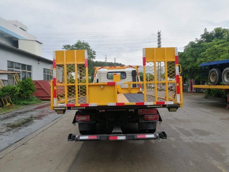 该车安装清障平板,绞盘,钢丝绳,油缸等专用装置,通过拖曳,背载方式,牵引车辆至平板上进行背载运输,用于道路故障车辆、城市违章车辆清障等工作,托举质量为2605kg;选装无后尾板装置平台,当选装无后尾板装置平台时整车长度,宽度不变,整车高度为2360mm,整备质量为5180kg,托举质量为2905kg;选装摆臂;侧防护材料为Q235A,与底盘大梁采用螺栓连接;后防护装置由专用装置结构替代,下缘离地高度495mm; ABS系统型号: CM4XL-4S/4M,ABS生产厂家: 广州瑞立科密汽车电子股份有限公司.随底盘选装驾驶室. |