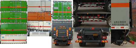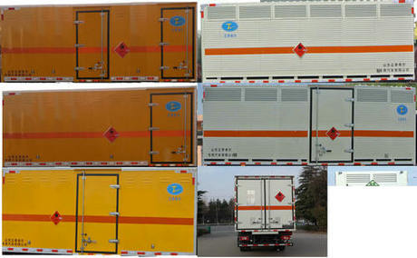 厢体顶部封闭,不可开启;厢体选装无侧门;选装不燃标志牌;选装不同形式的后门拉杆;厢体可选装多种形式的侧开门;选装瓦楞工艺厢体;后部选装通风窗;前部选装通风孔;随底盘选装排半驾驶室;车身侧面及后部粘贴橙色反光标识和易燃气体菱形标示;该车为危险货物运输车辆;在车体后部设置安全标示;仅选用底盘3800mm轴距;运送危险品类项号:2.1;2.2;侧防护装置材料为冷板B-1.5-BG/T708,与车辆连接方式为螺栓连接;后防护装置材料为510L-6.0-GB/T709,与车辆连接方式为螺栓连接;后防护断面宽120×70mm,离地高490mm;发动机F3.8NS6B156最大净功率为112Kw.ABS生产厂家/型号:威伯科汽车控制系统(中国)有限公司/ABS-E;安装具有卫星定位功能的行驶记录仪;仅采用前盘制动和限速装置的底盘;排气管前置;仅用子午线轮胎;油耗对应关系:17.17(F3.8NS6B156);选装不同形式的瓦楞工艺厢体;选装液压尾板,尾板收起状态的水平长度295mm,尾板总质量1000KG,尾板额定载荷1500KG,后防护装置材料为Q235圆管-2.0,与车辆连接方式为螺栓连接,后防护断面直径120mm,离地高500mm |