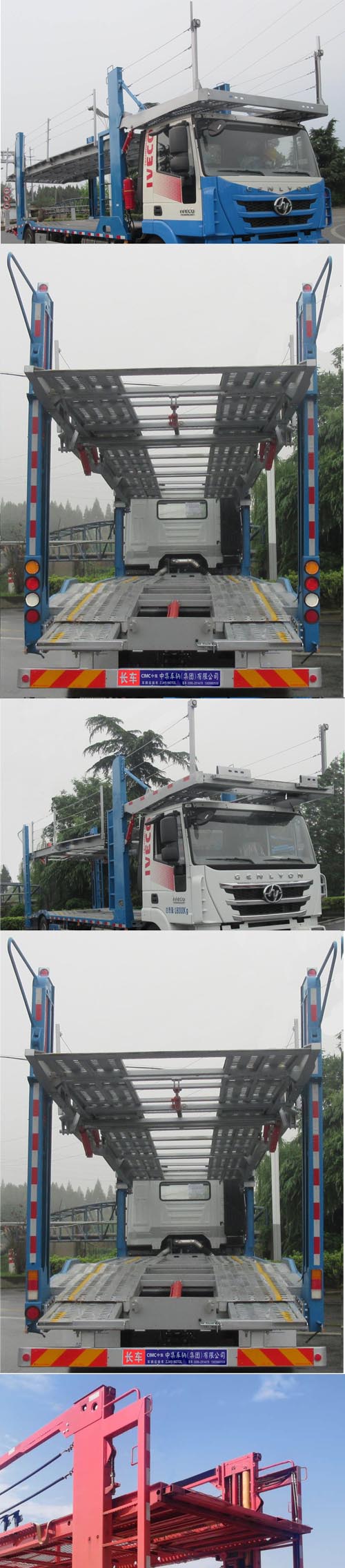 中集牌上汽红岩单桥国五车辆运输车轿运车外观时尚,设计更加科学,外形尺寸为12000×2550×3990(mm),整车的上户吨位为5870,6570(kg),总质量为18000(kg),上装的上层板和下层板之间的距离可以调整,以适应装载不同的车型;低合金高强度钢的上装材质的使用,让整车的质量更轻,承载力更强;采用进口的液压系统,操作简单,安全性大大提高。