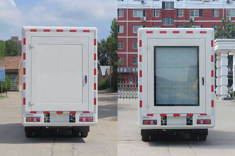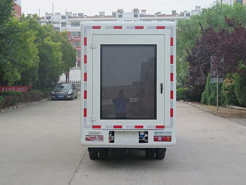 鸿雁牌MS5034XXCH型宣传车整车的外形尺寸为5460×1750×2710(mm),车身颜色搭配LED显示屏的颜色再加上广告的炫彩,非常吸引人的眼球。箱体左右后三面都可选装LED显示屏,屏幕的清晰度随您挑选。该显示屏显示的色彩与播放源的色彩保持高度一致,显示出来的图像真实感极强。