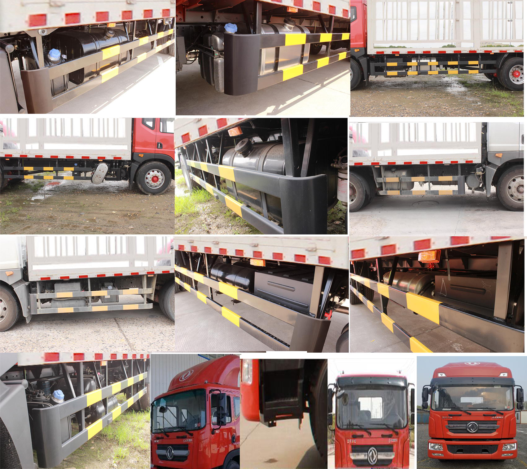 选装导流罩及样式,选装车箱栏板形式.选装液压尾板,收起状态的水平长度为290mm.尾板质量450kg.车厢底板到顶部高度为2500mm.ABS系统生产厂家,型号 :焦作博瑞克控制技术有限公司,J ABS;襄阳东风隆诚机械有限责任公司,ABS/ASR-24V-4S/4M.应装具有卫星定位功能的行驶记录仪,侧面防护装置材料为Q235,后下部防护材料为D510L,与车架采用螺栓连接.后下部防护装置断面尺寸(mm):120×60,离地高度:480mm.选装液压尾板时,后防护为三段式,与车架焊接.随底盘选装铝合金油箱,遮阳罩,绿色滤光带,踏步.选装限速装置时最高车速为:89km/h.该车型可选装ETC车载装置.选装燃油箱,电瓶,尿素罐,储气筒左右安装位置. |