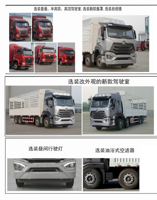 | 备注 | 该车可选装普通或半高顶驾驶室,同时可不选装导流罩;选装高顶驾驶室,同时可不选装导风板。选装驾驶室面罩。选装改外观的新款驾驶室。选装昼间行驶灯。选装后视镜。该车可不选装副保险杠和第三级上车踏板。该车可选装货厢外观结构。可选装单侧或双侧爬梯、工具箱、储物箱。该车可选装限速装置,限速89km/h。安装具有卫星定位功能的行驶记录仪。当选装MC11.44-50发动机时,需选装导流罩。 | ||||||||||